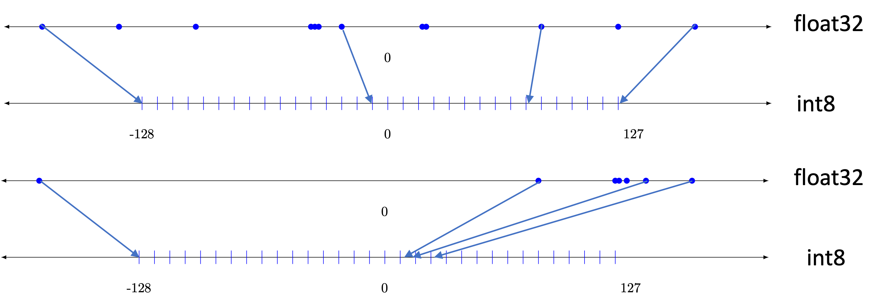 The immediate problem is outliers: a single extreme value inflates \(\max|\mathbf{x}|\), spreading the 16 available bins across a much wider range than necessary (Figure 3.4). Most weights cluster near zero, so the majority of bins end up assigned to regions where almost no values lie.