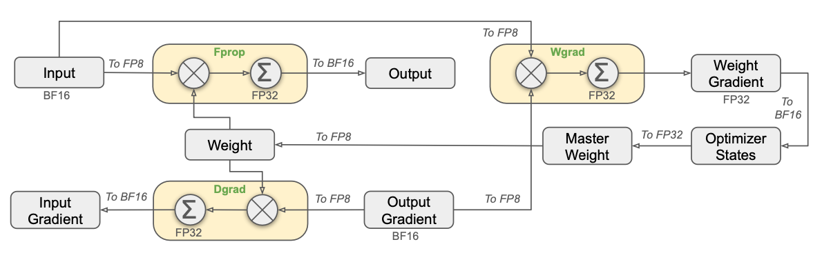 Example 3.2 (DeepSeek FP8 Training Strategy) DeepSeek-V3 [2] was one of the first large-scale models to successfully use FP8 precision during pre-training, pushing precision even lower than BF16 for the most compute-intensive operations. The FP8 format used is E4M3: 1 sign bit, 4 exponent bits, and 3 mantissa bits. This provides a range of approximately \(\pm 448\) with very coarse precision. E4M3 can represent only \(2^8 = 256\) distinct values, compared to BF16’s \(2^{16} = 65{,}536\).