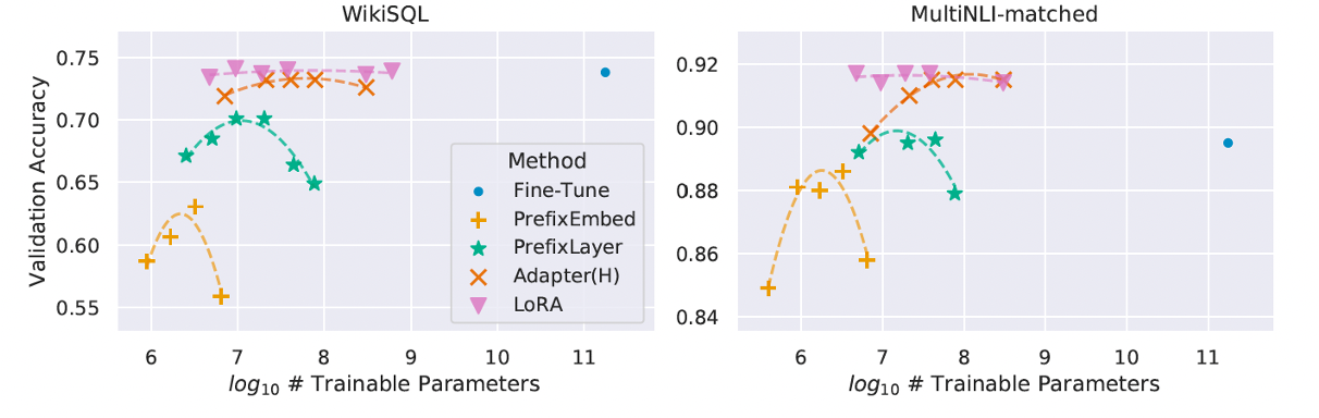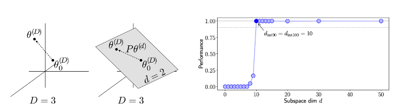 LoRA provides an elegant alternative based on observations that the weight updates during fine-tuning have low intrinsic dimensionality. The theoretical motivation comes from work on the structure of neural network loss landscapes. Li et al. [5] showed that, for many neural networks, the loss can be optimised almost as well within a much lower-dimensional subspace than the full parameter space by training only in a random linear subspace of the specified dimensionality (i.e., projecting gradients onto a fixed random basis). This can be seen in Figure 3.2 where at a subspace dim of 10 the performance is already saturated. Aghajanyan et al. [6] extended this observation to language model fine-tuning, finding that the intrinsic dimensionality of the fine-tuning objective tends to decrease as models grow larger.