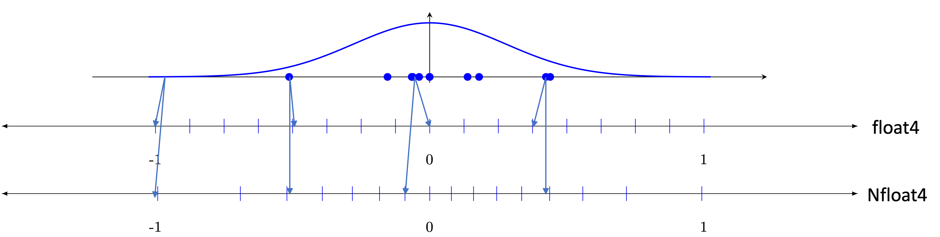 Nearest-neighbour quantisation. With values normalised to \([-1, 1]\), the kernel maps each value to one of 16 NF4 codes. Rather than computing distances to all 16 levels, it uses a hard-coded binary decision tree of 15 thresholds — each threshold is the midpoint between two adjacent NF4 levels: